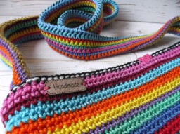 Ručně háčkovaná bavlněná taška s podšívkou v pestrobarevném "boho" stylu. Velikost na A4 s dlouhým uchem přes rameno, ucho pevné (vyztužené). Jednoduché zapínání na velký knoflík (dle skladových zásob). Ozdobeno korálky (perličkami) a háčkovanou mandalou, malý háčkovaný přívěsek na kterém jsou zavěšeny v páru minerály pro harmonizaci čaker (jaspis, karneol, citrín, avanturín, tyrkenit, lapis lazuli, ametyst).