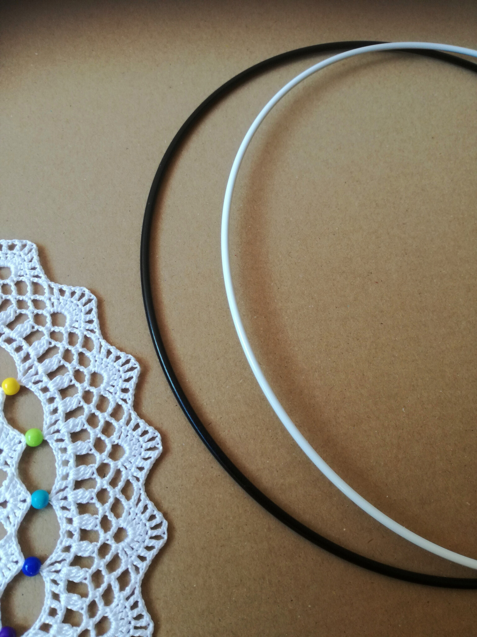 v omotaném kruhu: lehce naškrobená krajka vypnutá do kovového kruhu, který je omotaný bavlněnou přízí stejné barvy jako krajka (průměr 20 cm)