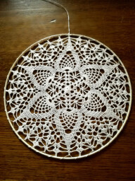 v omotaném kruhu: lehce naškrobená krajka vypnutá do kovového kruhu, který je omotaný bavlněnou přízí stejné barvy jako krajka (průměr 25 cm)