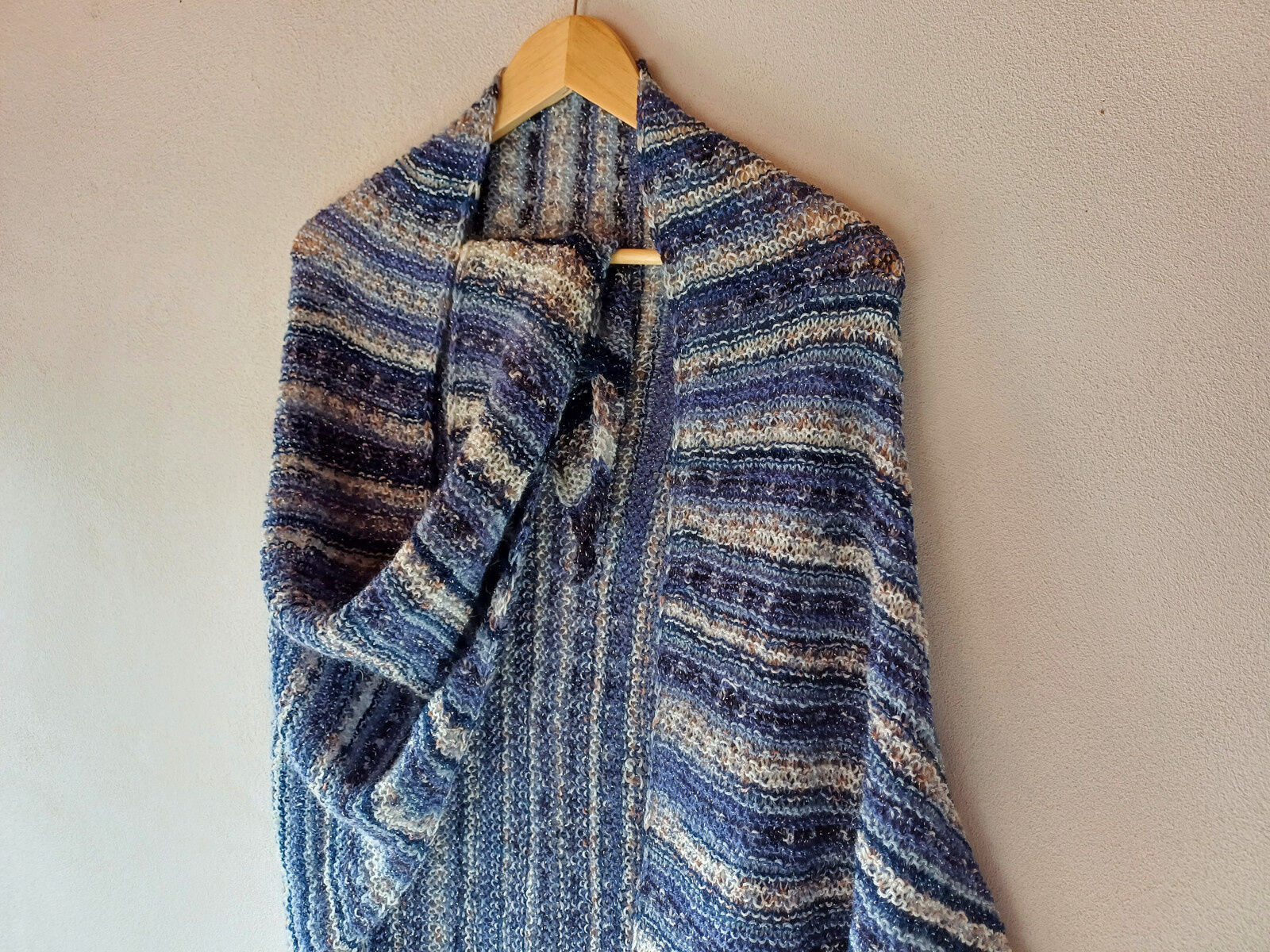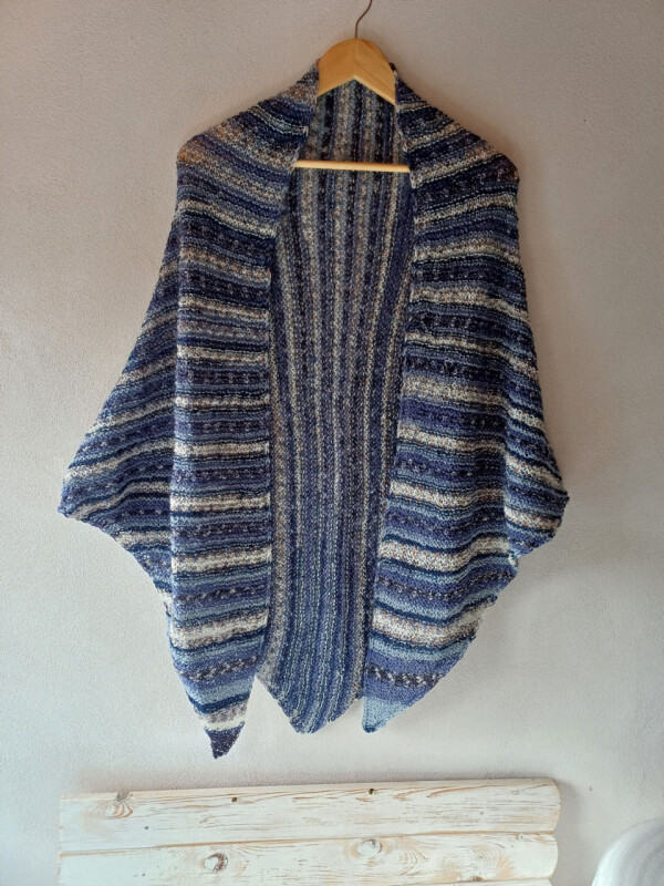 Ručně pletený šátek se střídavými přechody v příjemných barvách džínové modré, smetanové a světle modré s blýskavými odlesky stříbrné barvy díky vpletenému lurexu!