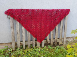 Ručně háčkovaný šátek z jemné příze a červeným odleskem lurexu ve vínové barvě.