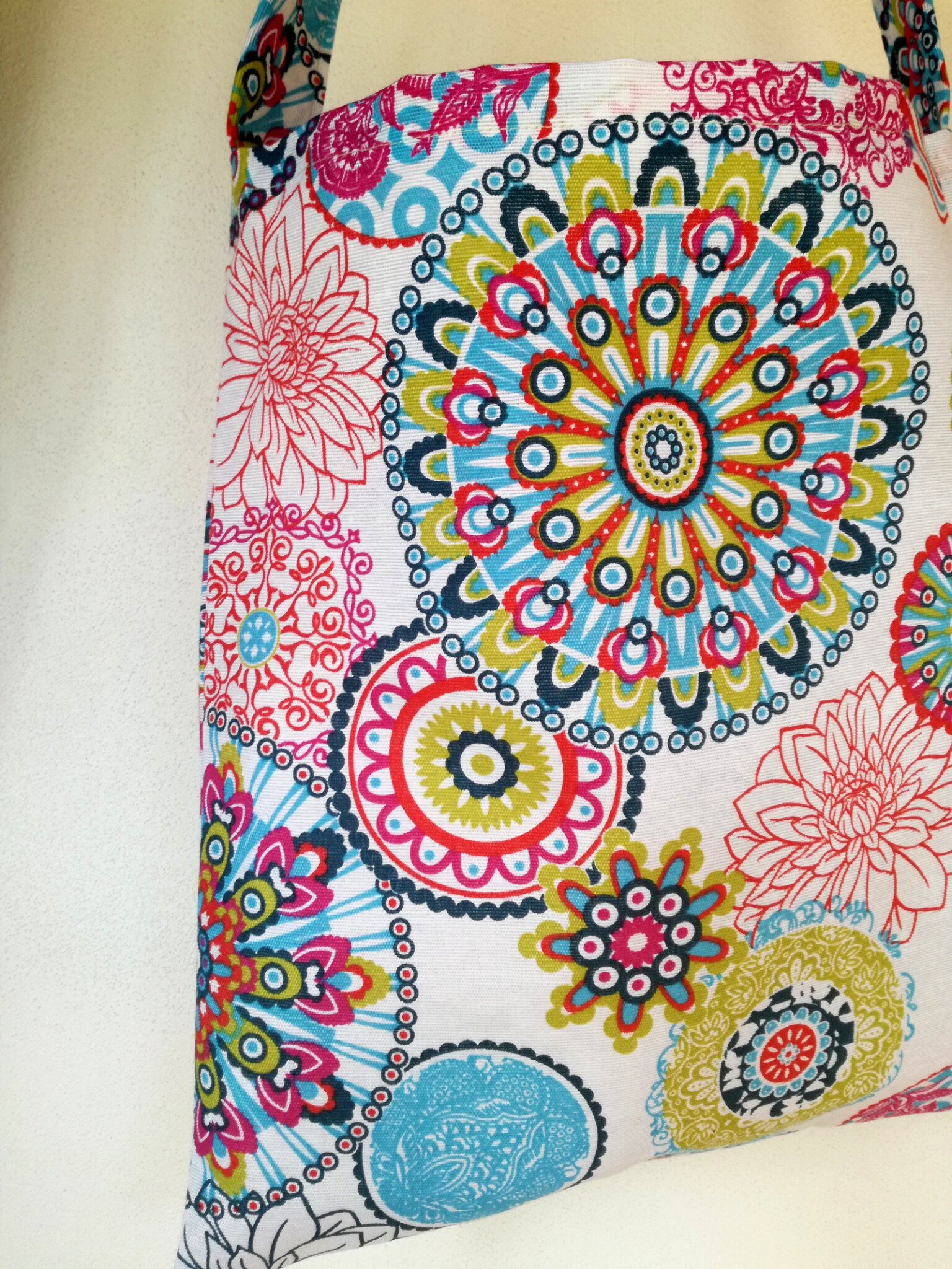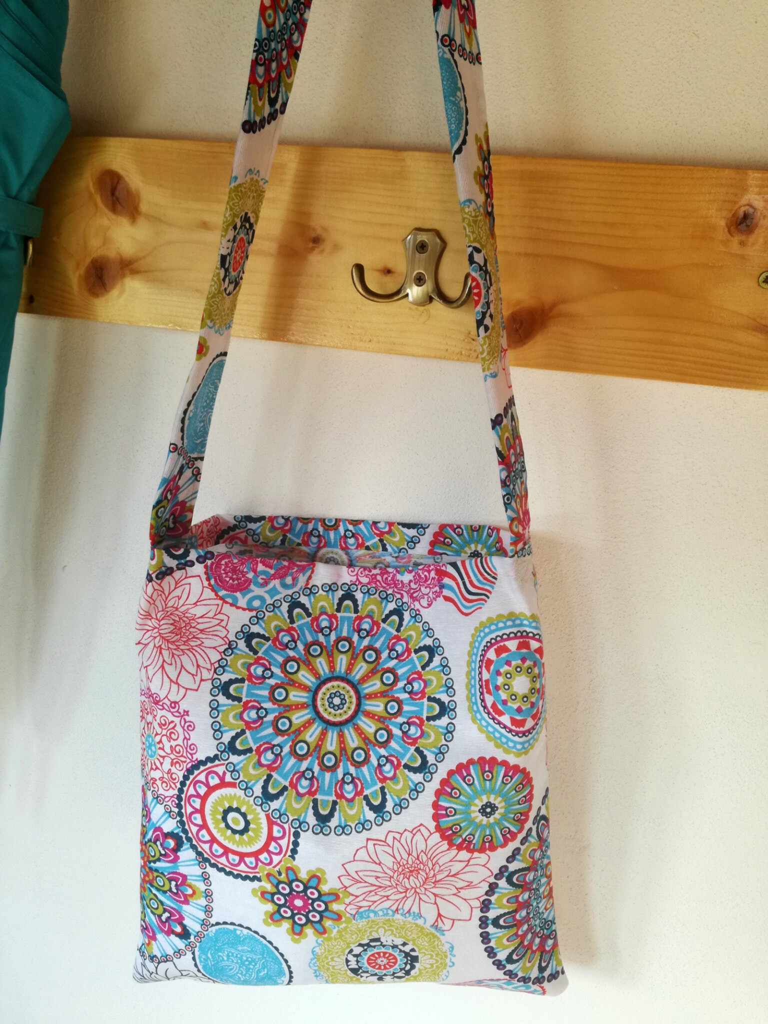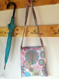 Ušitá z moderní a velmi pevné látky větší gramáže. Zpevněné ucho přes rameno, nádherné mandaly v různobarevném podání "boho".
